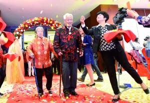 重阳节前,东外大街北社区为28对金婚老人举行了金婚庆典。老夫妇们携手走上铺满鲜花的红毯,接受大家的祝福。 北京晨报记者 王萍/文 首席摄影记者 吴宁/摄