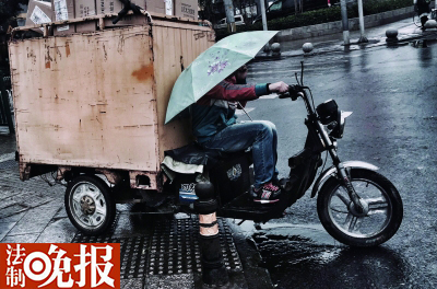 北新桥附近,一位正在送货的快递员撑起了雨伞。摄/记者 柴程
