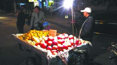 晚上,游商们拉着电灯开“夜市”,高声甩卖处理的蔬菜、水果。