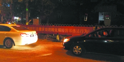 劲松街道在潘家园路上挂出的标语:“狠狠打击露天烧烤和无照经营等违法行为”。