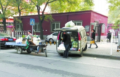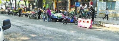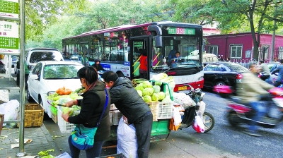 清楚这一“地界”的还有不少外地来京的无照流动商贩。每天早晨六七点,几十名游商便在“地界”附近占道摆摊,卖蔬菜、水果,直到夜晚才收摊。一辆辆卖货的电动三轮车挤在路边停放的私家车中间,有的干脆停在公交车站,使得34路、特12路公交车无法进站。经过这里的骑车人和行人都须左躲右闪,啧有烦言。