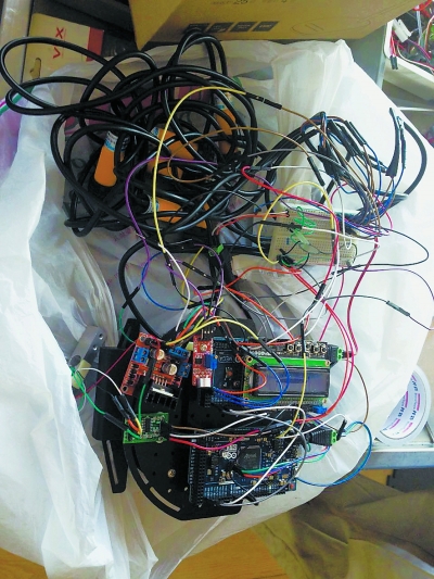 最难的部分解决了,磨合中的垃圾智能分类系统还是问题不断。“虽然在制作之前,我曾经认真绘制过图纸,大小部件的位置都经过精心安排,也曾模拟运行成功,但是实际操作过程中还是经历了比较繁琐的调整期。”部件安放位置不精确,致使下压结构卡住;运算数据太大,造成电路板烧毁;电路接、插出现问题,造成电路纠结在一起……这些小毛病在“智能垃圾桶”刚刚成型的时候时常出现,带来困扰。