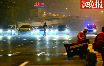 施工人员正在将隔离栏从道路上移开,交警拦住车辆等待放行的通知摄/记者 郭谦