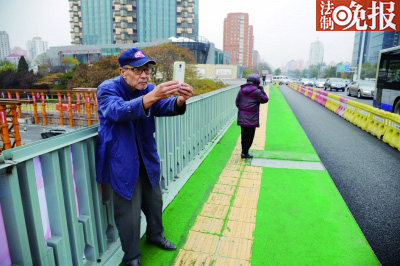 在三元桥边住了40年的老居民王大爷,看着31年的三元桥成长,今天特地来看新桥竣工,并拍照留影