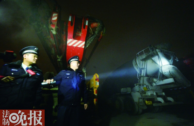昨晚,执法人员在通州运乔搅拌站查看搅拌车是否停工 摄/记者 刘畅