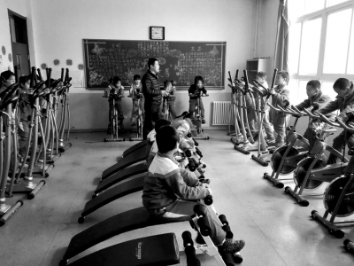 在实验二小永定分校,学生们纷纷在健身房里上体育课,踩单车、仰卧起坐、跑步机,借助器械进行体育锻炼。据了解,门头沟区已为所有中小学配套建设了健身房,因此,雾霾橙色预警时,很多学校选择分班在健身房里上体育课。