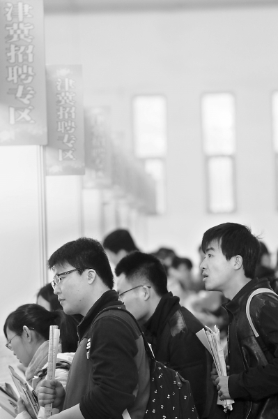 上周末,应聘者们在2016年北京地区毕业研究生专场招聘会特设的津冀企业展台前咨询。当日,本年度规模最大的北京地区毕业研究生专场招聘会在国际展览中心举行。725家用人单位提供就业岗位1.85万个,吸引数万毕业生前来求职应聘。本报记者 孙戉摄