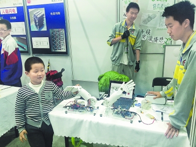 小创客们还为这双“手”设计了有温度的“皮肤”。在薄膜里安装电热丝,通过温度传感器,可以检测“握手”时的体温,并通过电信号的传递让对方握住一只有温度的“手”。“现在的‘皮肤’还比较原始,通过后期的完善,我们希望能制作出更逼真的‘肤质’,让情感交流机更加拟人化!”