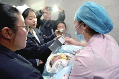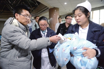 巴掌宝宝被送到八一儿童医院治疗,医院护士正在验明身份,接收孩子进入病房。京华时报记者谭青摄