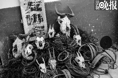 在余家华家中,从山上拆下的钢丝猎套及野生动物的头骨被成堆置于院内。这只是巡山队员近十年拆卸的9万个猎套中的一小部分