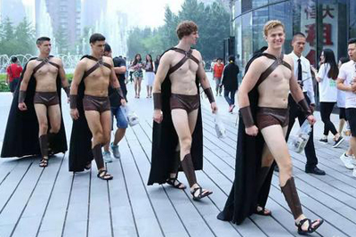 北京时间7月22日中午,CBD地区突然出现数十位上身赤裸的今晚号称“攻占帝都”的外籍男子,引来不少路人关注。记者从网友发布的照片中看到,这些外籍男子肤色、发型各异,但着装统一。赤裸上身缚有一条X形的背带,肩披大披风,身穿一条看似皮制的短裤以及同样材质的凉鞋,看上去酷似电影中斯巴达三百勇士的形象。