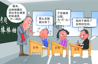 该考试今年“设计基础”科目的考题是让考生先吃糖再以品出的味道进行设计。面对另类的考试,叫好的考生称品尝到了“久违的初春的甜蜜”;可也有人欲哭无泪,哭诉“被棒棒糖斩落马下”。