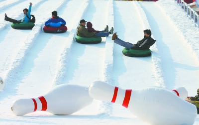 在玉渊潭公园南门附近,雪场已准备就绪。为庆祝成功申办2022年冬奥会,今年玉渊潭特别组织了“冬奥之旅——雪地迷宫”,包含滑雪、冰壶等十余个奥运项目寻宝活动。今年,公园还特别为小朋友量身订制了6条15米的儿童雪圈滑道。雪场内设置了多项娱乐、游戏、健身项目。3辆雪地摩托车首次“开进”玉渊潭,为游客提供雪上驾驶的乐趣;首次设置的儿童充气城堡乐园内,有蹦蹦床、雪地碰碰车等,还有戏雪区,让孩子们充分享受冰雪乐趣。雪场中,有3只憨态可掬的羊驼,迎接各方游客。