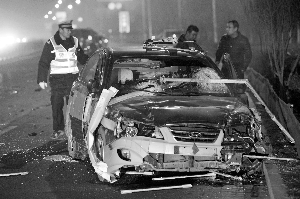 26日晚上8时许,北京晨报记者赶到事发现场时,一辆撞得残破不堪的出租车车头向南停在了由南向北最外侧的道路上。车子周围散落一地零件,车头的保险杆也掉在地上,车窗玻璃四碎满地,甚至有的零部件飞出了十余米。路中间的护栏已被两名道路抢修人员拖走,只剩下两根护栏钢条插进了出租车风挡玻璃后面的座位中。