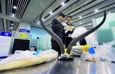 2015年,首都机场海关累计查获濒危动植物案件149起,仅象牙制品就查获了1895件,200余公斤。此外,还查获了犀牛角、豹皮、穿山甲片、玳瑁壳等各类濒危动植物制品712件。