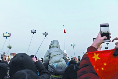 在进入广场的人群中,来自山东的张洋带着新婚妻子来看升旗了。“北京是我们旅行结婚的第一站,天安门看新年升国旗是我们新生活的开始。刚下火车,我们就赶来了。新年,新气象,也是一个新的开始。”张洋兴奋地说。