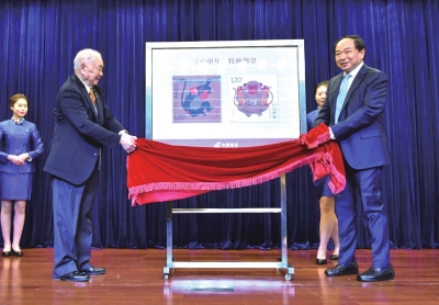 1月5日,《丙申年》生肖猴票的设计者黄永玉(前左)和中国邮政集团公司总经理李国华(前右)共同为新邮票发行揭幕。新华社发