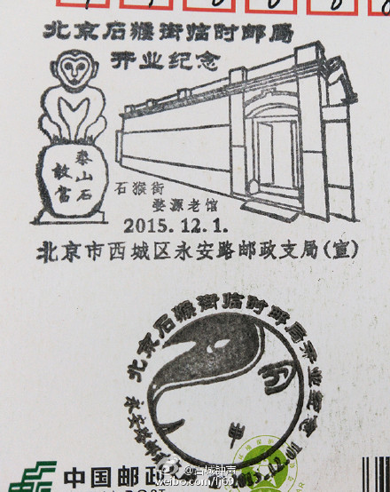 现而今,要说这条石猴街引起人们的关注,还得说到猴年,谁让它是京城现存猴地名的独苗呢!2015年12月1日,京城唯一一家以“猴”字命名的临时邮局在石猴街开门营业。所谓临时邮局,大多是为了为配合某项重大活动、重大庆典等而设。临时邮局所使用的邮戳多为专门刻制,有的是纪念邮戳,有的则为带有“流动”、“临时”字样的邮政日戳。