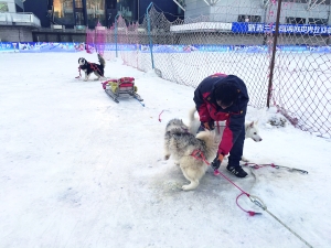 昨天下午2时许,记者来到位于工体南门附近的工体嘉年华。只见在场地的最内侧有一片儿单独的场地,门口写着“狗拉雪橇”的招牌,区域中有五条犬被拴在护栏上,其中两只身上套着拉雪橇的绳套。据工作人员称,如果没有购买通票,可以花50元买票,50元一次,每次只能一人乘坐。