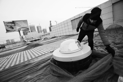 1月12日,工作人员在对通州商务中心区市政综合配套服务中心的环保采光筒进行巡查。该配套服务中心总面积一万余平方米,地上为绿化停车场及街心花园,地下三层配备真空垃圾回收系统、智能立体车库、监控系统中心和利用自然光源的节能环保照明系统。该中心目前已开始试运行。