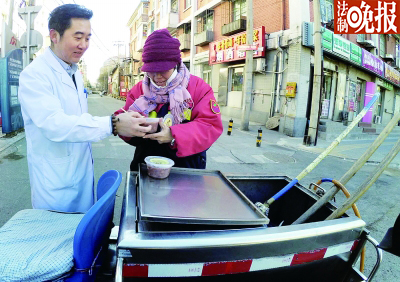 志愿者将一碗刚出锅的腊八粥送到环卫工人手中,慰问他们寒冷天坚持街面的保洁工作 摄/记者 林晖