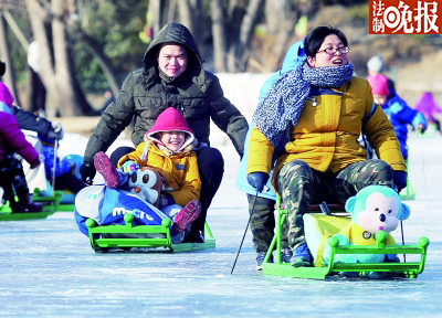 今天上午,记者在紫竹院公园看到,公园大湖、南北小湖都向游客开放,许多小游客排队滑京城“最长冰滑梯”,梯长32米的大型冰滑梯利用300余块特制冰块砌成6米高,从滑梯顶端呼啸而下,一下滑行出数十米远。