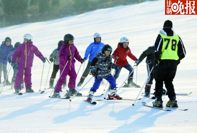 在渔阳滑雪场,一群孩子在跟着教练学滑雪,激起一片雪花摄/记者 曹博远