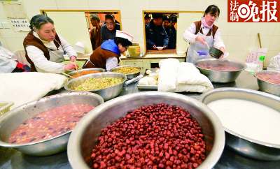 在广济寺的斋堂内,散发着各种粮食混合在一起熬制出来的特有香味,里面一个房间摆满了装满八宝粥的大桶。“总共要施舍200桶,现在已经熬了160桶,由于桶不够用,现在有一部分还在锅内熬着。”一名义工说道。