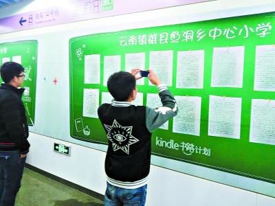 在地铁1号线与14号线大望路站的换乘通道内,一组由偏远地区小学生作文制成的公益广告,吸引着来往乘客的目光。据了解,这是中国扶贫基金会与商家共同发起的“书路计划”,这项公益计划将为云南、贵州、河南、河北、甘肃五省欠发达地区的十所农村小学捐建电子图书馆。