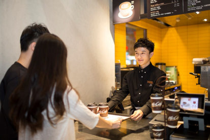 若选择传统点餐,小巧独立的点餐柜台,让顾客与接待员距离更近,沟通更容易。菜单和取餐牌使用动态电子屏幕,信息一目了然。此外,双点式柜台将点餐和取餐清楚划分,不仅服务更快,还满足了手机订餐、外卖服务的需要,为数字化餐饮、O2O闭环奠下基石。