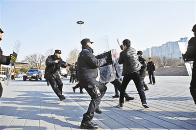 “局属各单位请注意,在朝阳公园喷泉广场北侧发现一名持菜刀男子,请各警种立即赶赴现场进行处置!”在昨天的演练现场,北青报记者看到,伴随着电台里传来的指令,数名警力立即到达指定位置开展工作。经谈判无果后,特警迅速靠近嫌疑人击落菜刀,将嫌疑人摁倒在地后带走。