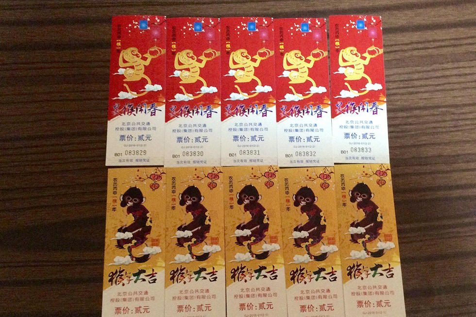 此前,北京公交集团此前发布消息称,2月1日首班车开始,所属有人售票线路上发售发行2016年猴年生肖春节纪念车票。纪念车票一套2张,以“猴年大吉”和“灵猴闹春”为主题,每张票价2元。此消息一出,不少纪念票爱好者开始摩拳擦掌准备抢票。