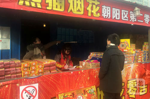 上午10时许,千龙网记者在位于三里屯世茂中心附近的一家烟花爆竹零售网点看到,已有心急的市民前来采购了。摊主李先生告诉记者,开卖头一天通常货走得并不多,但没想到一开张挂鞭就卖得特别好。