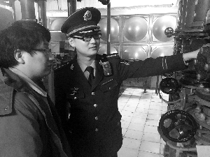 前不久,北京遭遇极寒天气,综合大厅的水泵房喷头被冻裂11处,这也让刘小龙放心不下,从中控室出来后,他又来到水泵房检查(如图)。和值班人员一同测试了报警之后,他才放了心。
