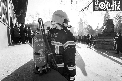 消防员背着便携式灭火器在香炉旁随时待命。付丁 摄
