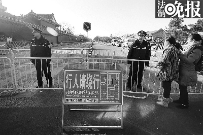 法晚记者看到,雍和宫内一阵风吹过,香灰迎面飘来,刮得眼睛有些睁不开想流泪,民警老张说他在这里每天基本上都要转上10多圈。为了防止人群密集,警方在大殿两侧拉起警戒线,疏导客流从南边的正门进入,焚香祷告结束后,从北门东西两侧出,形成单线游园。文/记者 张群琛 唐宁