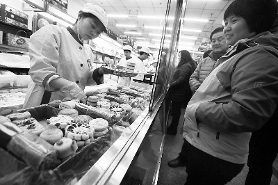 今天一大早,记者在位于东直门附近的一家北京稻香村门店看到,刚一开门顾客就迅速围到窗口前,不到10分钟店已经排起了一条长队。