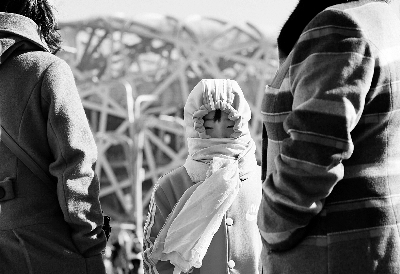上午在寒风中游览鸟巢的游客将自己裹得严严实实