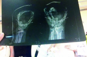 昨天下午,记者来到了朝阳急诊抢救中心的住院部,在外伤病房内,记者看到了病床上的刘成超。他的右手完全包裹着白色的纱布,完全无法使用。他告诉记者,目前他只能用左手做事情,现在手中已经打进了三个钢钉(见图),至于以后自己的手掌是什么样的结果,他也不知道。