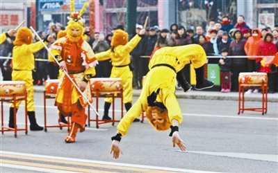 今年花会上,一群技艺精湛的民间艺人及学生,扮成孙悟空的形象,打着幡鼓,耍着长棍,一路吸引着观众的目光。作为特邀表演项目,久负盛名的河北省承德市宽城县非遗项目——“背杆”,成为今年平谷花会的新亮点。