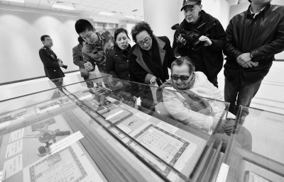 1日在军事博物馆,东北老航校人赵宁在家人和到场观众的陪同下观看有关老航校的历史文物和相关文献照片。当天,纪念东北老航校成立70周年文物捐赠仪式在这里举行。本报记者饶强摄