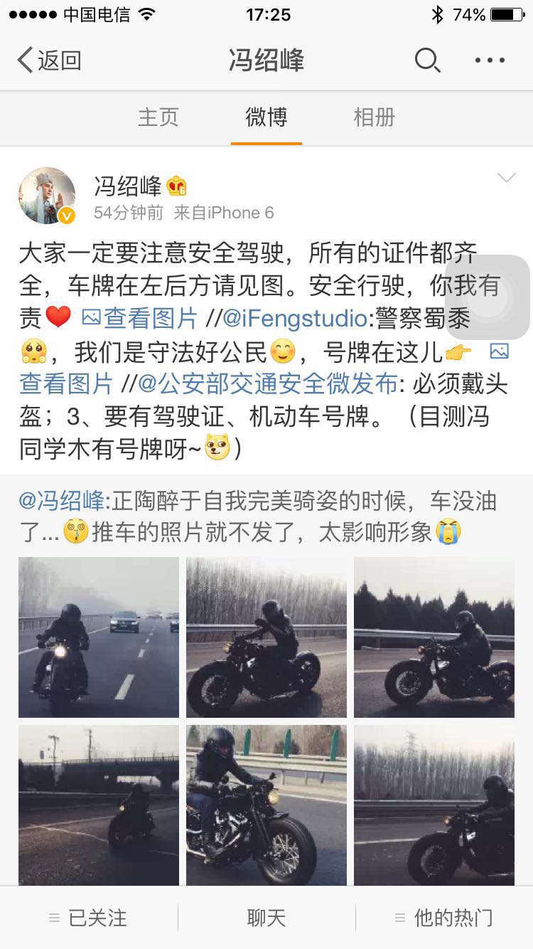 千龙-法晚联合报道 (实习记者 张婷) 今日(3日)中午,演员冯绍峰在其官方微博发布了一组照片,照片显示,冯绍峰驾驶着一辆黑色摩托车在高速上行驶。并配文称:“正陶醉于自我完美骑姿的时候,车没油了...推车的照片就不发了,太影响形象[泪]。”