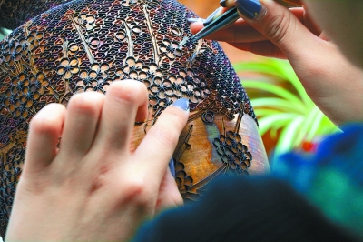 盘金,是京绣“金绣”中相当复杂的一门技艺。它是用捻好的金线盘成金龙的样子固定在龙袍上,再用蚕丝线进行固定。盘一条金龙,不仅全部采用手工制作,龙鳞还要分别朝不同方向,最重要的是,这根金线必须“一线到底”,不允许折断、剪断。要达到盘得圆是圆、角是角,没有多年的锤炼,根本做不到。