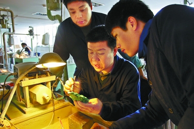 谈到技艺的传承,他还是有些担忧。过去,玉雕是对身体伤害较大的一门技艺,女工只要45岁,男工55岁,就可办理退休。现在,技术条件虽然有所进步,但是“慢”这一点却没有变。玉雕这门手艺能养活人,但是那些费时费工的工艺却没人愿意学了。“不是不能挣钱,而是见效太慢。” 张铁成惋惜地说,玉雕现在是很热门,但是大多数人学几年之后就会自立门户,一些人一知半解地出去了,虽然挣了钱,但是没有把料用好。张铁成常说,玉雕讲究量料取材。他也像治玉一样,因材施教,鼓励徒弟创新,探索心中的玉雕艺术。