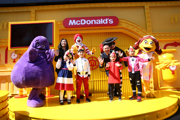 北京麦当劳食品有限公司总经理张帆先生、副总经理周炜女士与麦当劳叔叔及他的朋友们,小朋友们准备开启“奇趣玩具工厂”大门。