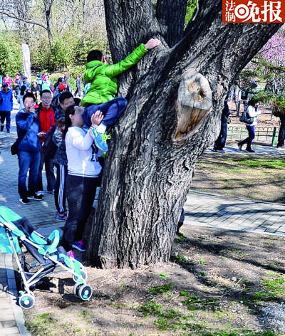 玉渊潭公园内,一名女游客托着孩子攀爬树木 摄/记者 郭谦