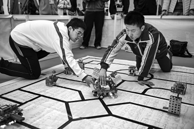 高中生组的机器人竞赛更激烈。来自理工大学附属中学的初二学生郭亦杨、刘若琳组成了一支“巾帼队伍”,她们从小学开始涉猎机器人竞赛,从FLL机器人工程挑战赛到今年参加的机器人足球比赛,沉浸机器人世界已有两三年时间了。“中国以后也要造能下棋的机器人,而且我们女生也要参与。” 刘若琳说。