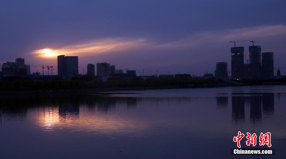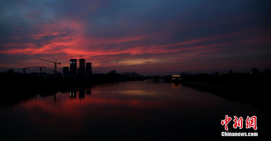 4月3日,傍晚的霞光映红了北京京杭大运河畔。当日是清明小长假的第二天,北京空气质量优,适宜民众出行赏花。 中新社记者 杨可佳 摄