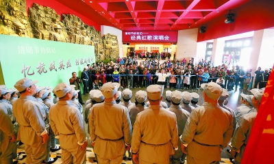 “为了社会幸福,为了民族生存,巩固团结坚决的斗争……”4月4日的中国人民抗日战争纪念馆里,铿锵有力的《新四军军歌》响起,现场观众或驻足聆听,或跟着哼唱起来。