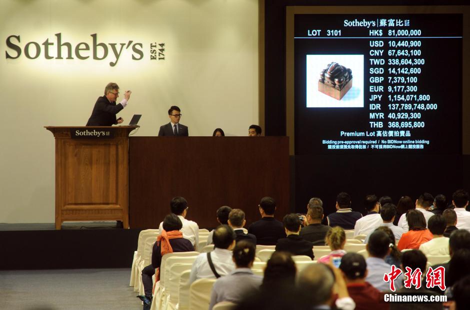 4月6日,香港苏富比2016春拍在香港会议展览中心举行,清康熙“敬天勤民”檀香木玺以9260万港元成交,创下康熙印玺世界拍卖纪录。 中新社记者 谭达明 摄
